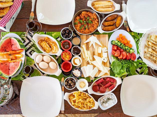 A full Turkish breakfast with the baked goods including the Turkish crossiants made in house. The fruits are varied and often come from the garden. The preserves are homemade and the eggs organic.