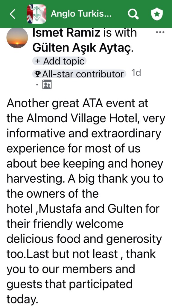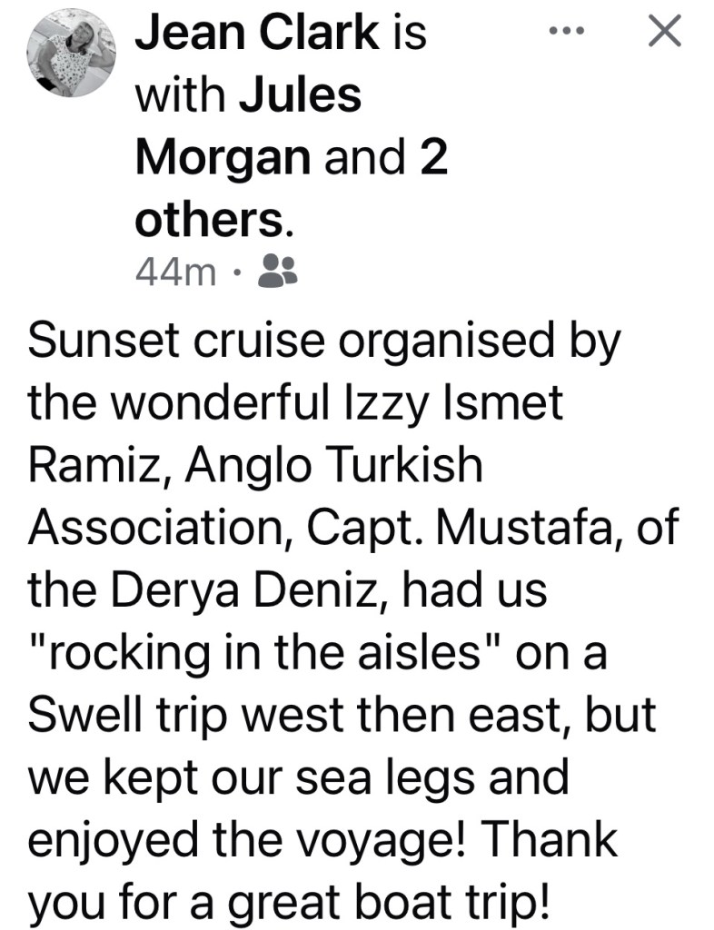 A minimum donation of 50TL to help the local ‘Good Causes’ the Association supports is included in the price of this event.