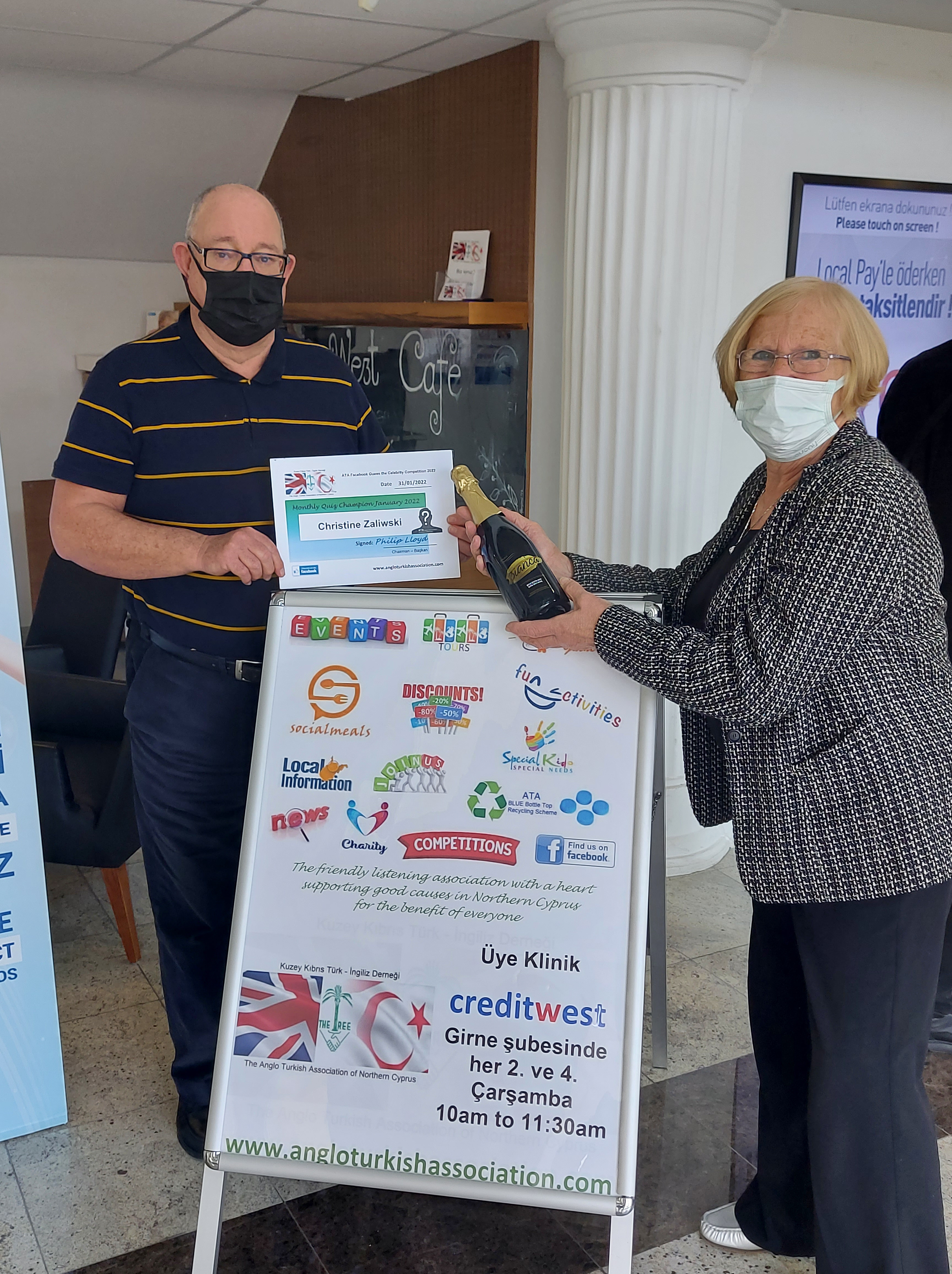 JANUARY 2022 Monthly prize winner (person with the most correct guesses during the month) is: – Christine Zaliwski seen here receiving her prize and certificate from the association chairman