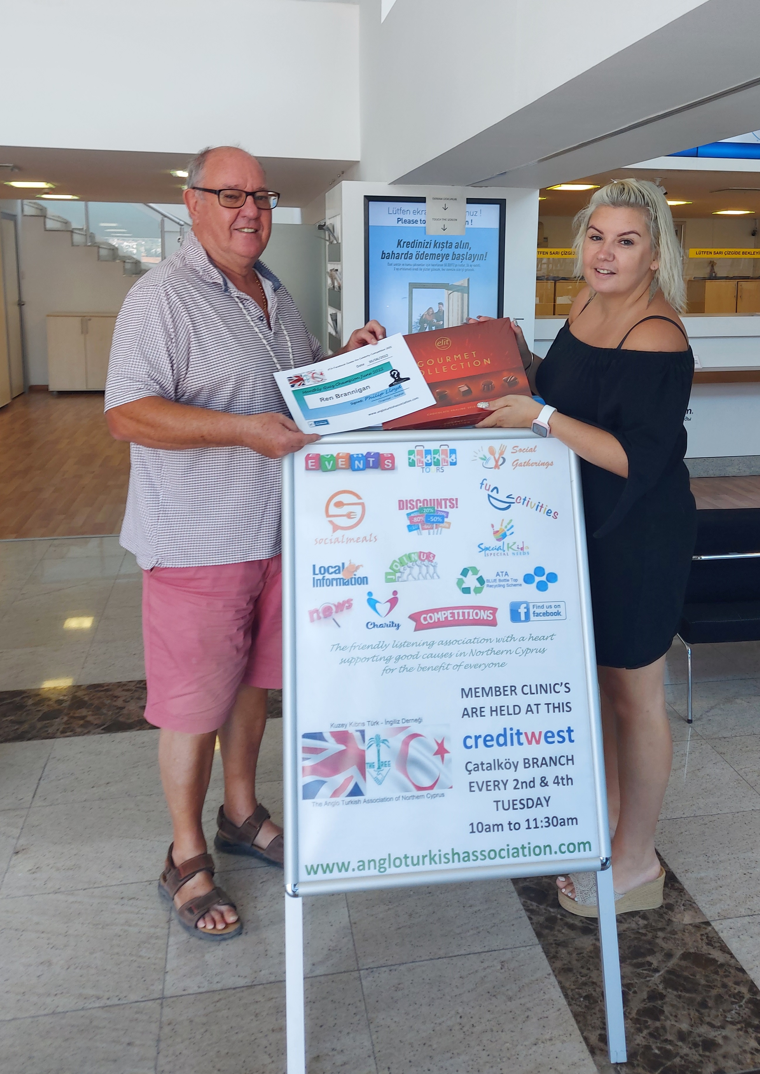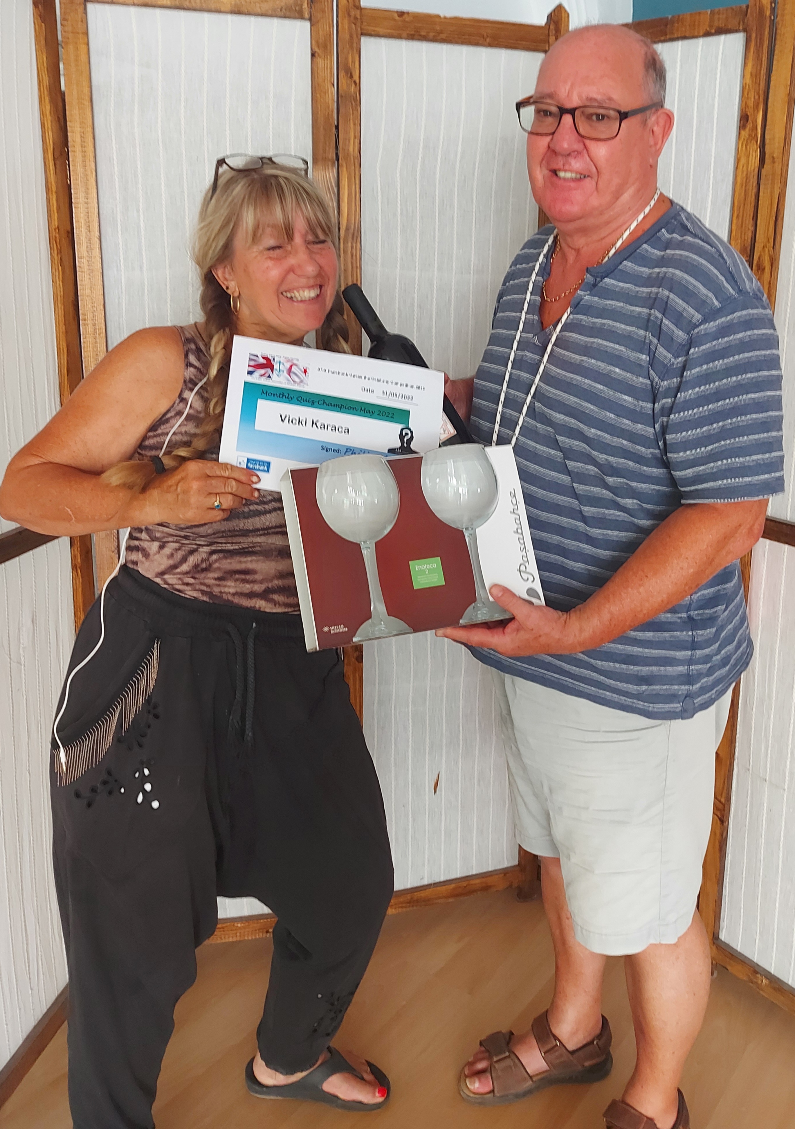 AUGUST 2021 Monthly prize winner (person with the most correct guesses during the month) is: – Hatice Kerimgil seen here receiving her prize and certificate from the association chairman