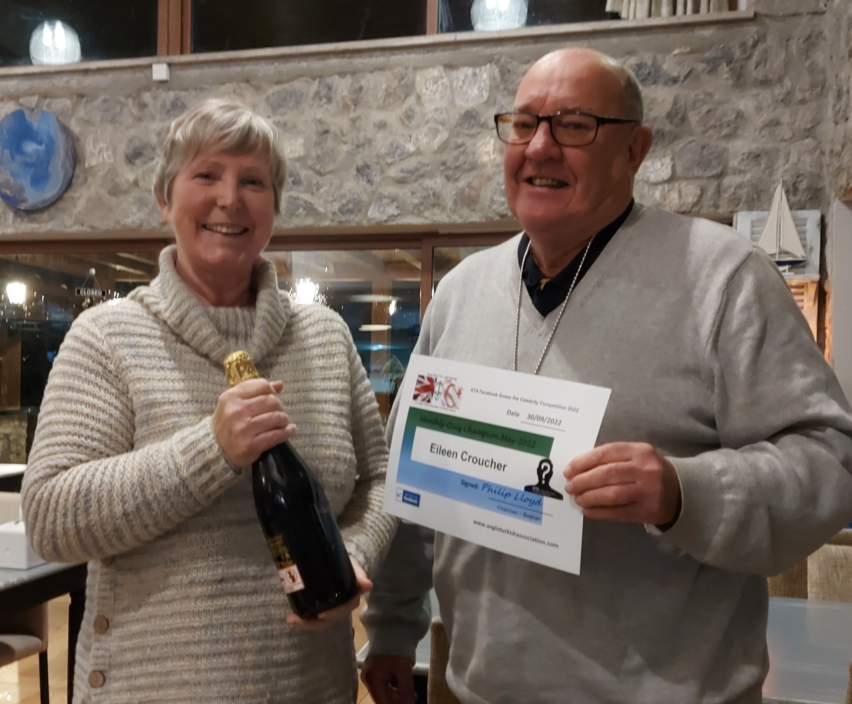 MAY 2023 Monthly prize winner (person with the most correct guesses during the month) is: – Eileen Croucher (L) seen here receiving her winners certificate from the associations Sandra Whyte