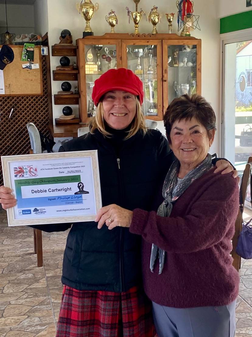 JANUARY 2023 Monthly prize winner (person with the most correct guesses during the month) is: – Debbie Cartwright (L) seen here receiving her winners certificate from the association’s Barbara Johnson (R)