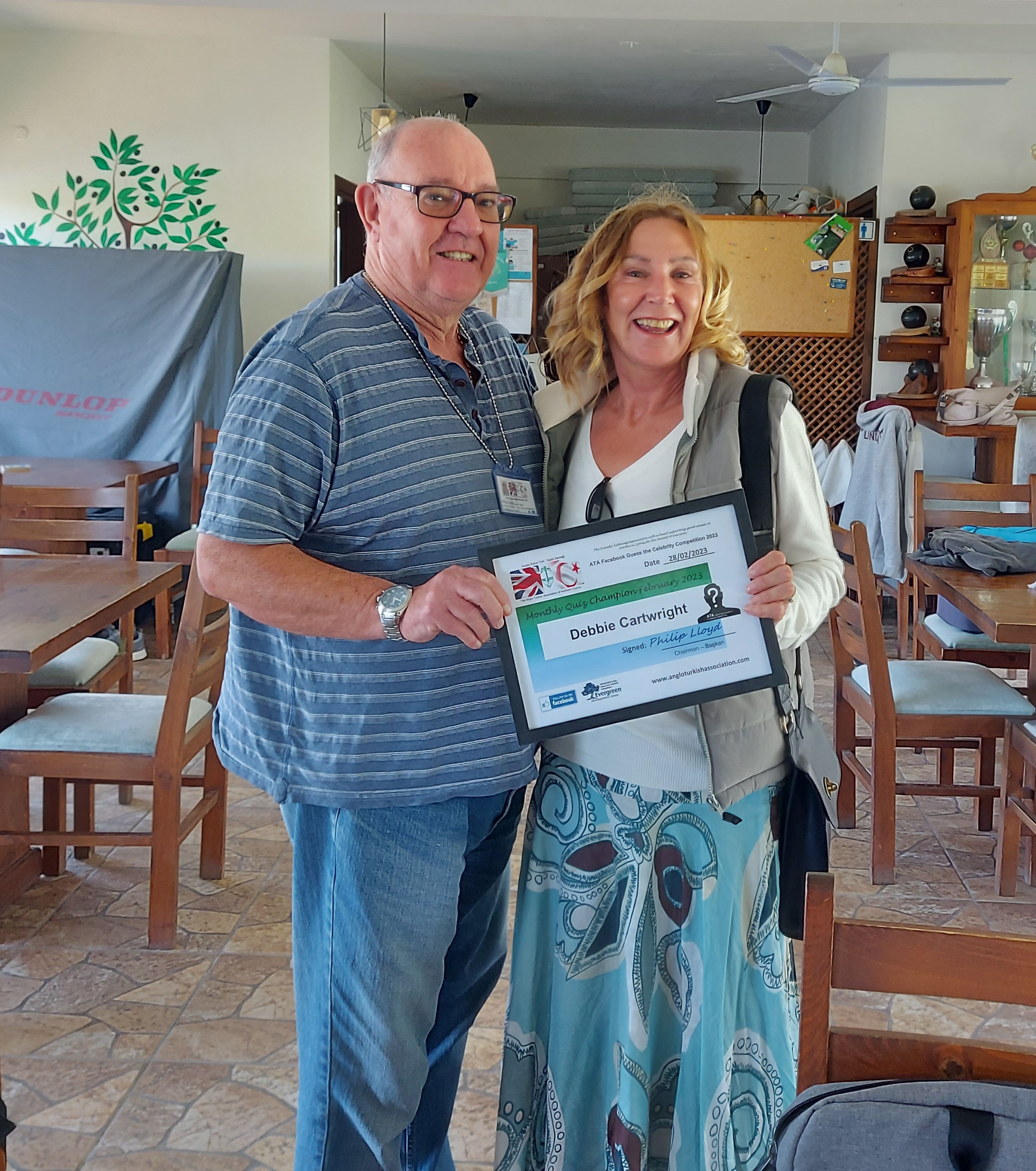 FEBRUARY 2023 Monthly prize winner (person with the most correct guesses during the month) is: – Debbie Cartwright (R) seen here receiving her winners certificate from the association’s Chairman