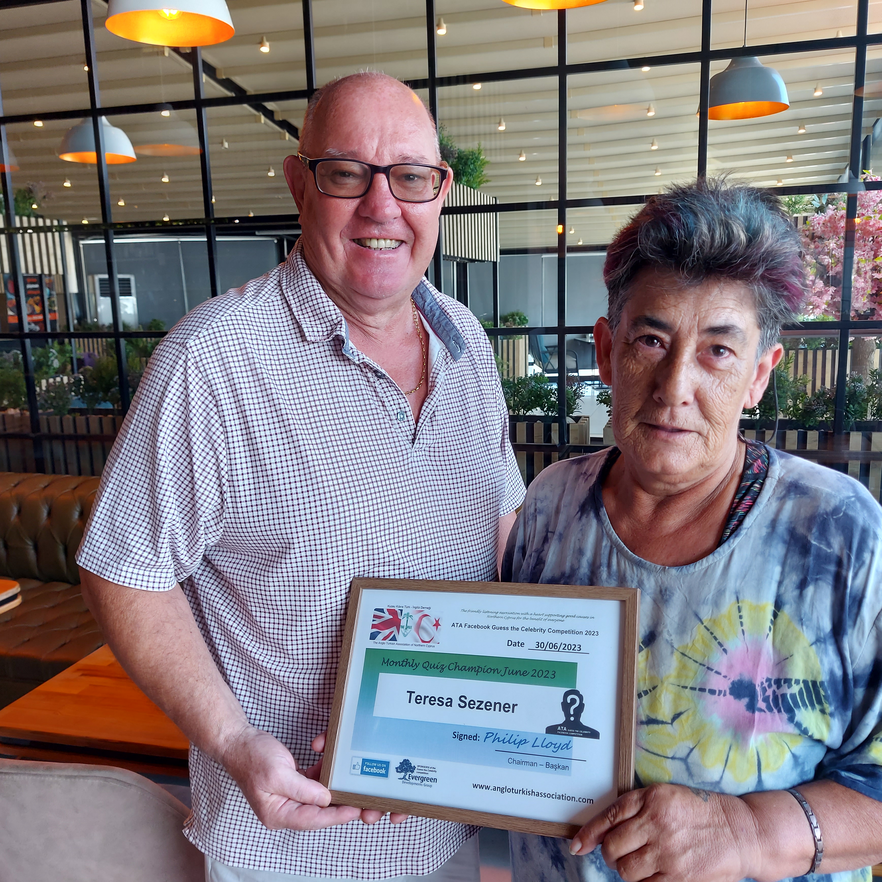 JUNE 2023 Monthly prize winner (person with the most correct guesses during the month) is: – Teresa Sezener seen here receiving her winners certificate from the associations chairman
