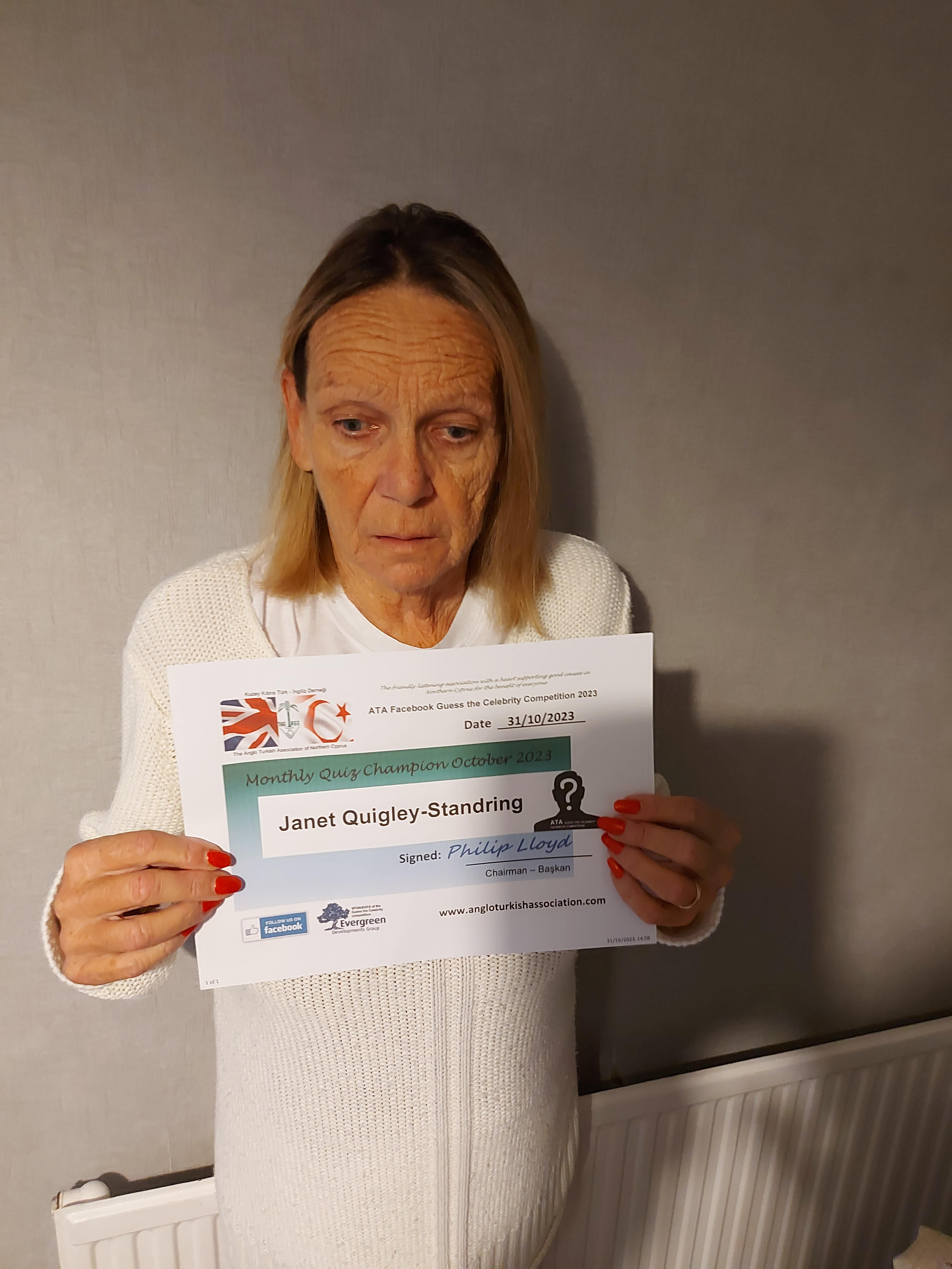 OCTOBER 2023 Monthly prize winner (person with the most correct guesses during the month) is: – Janet Quigley-Standring seen here in the UK with a copy of her winners’ certificate (the framed original will be presented to Janet when she returns to Northern Cyprus).
