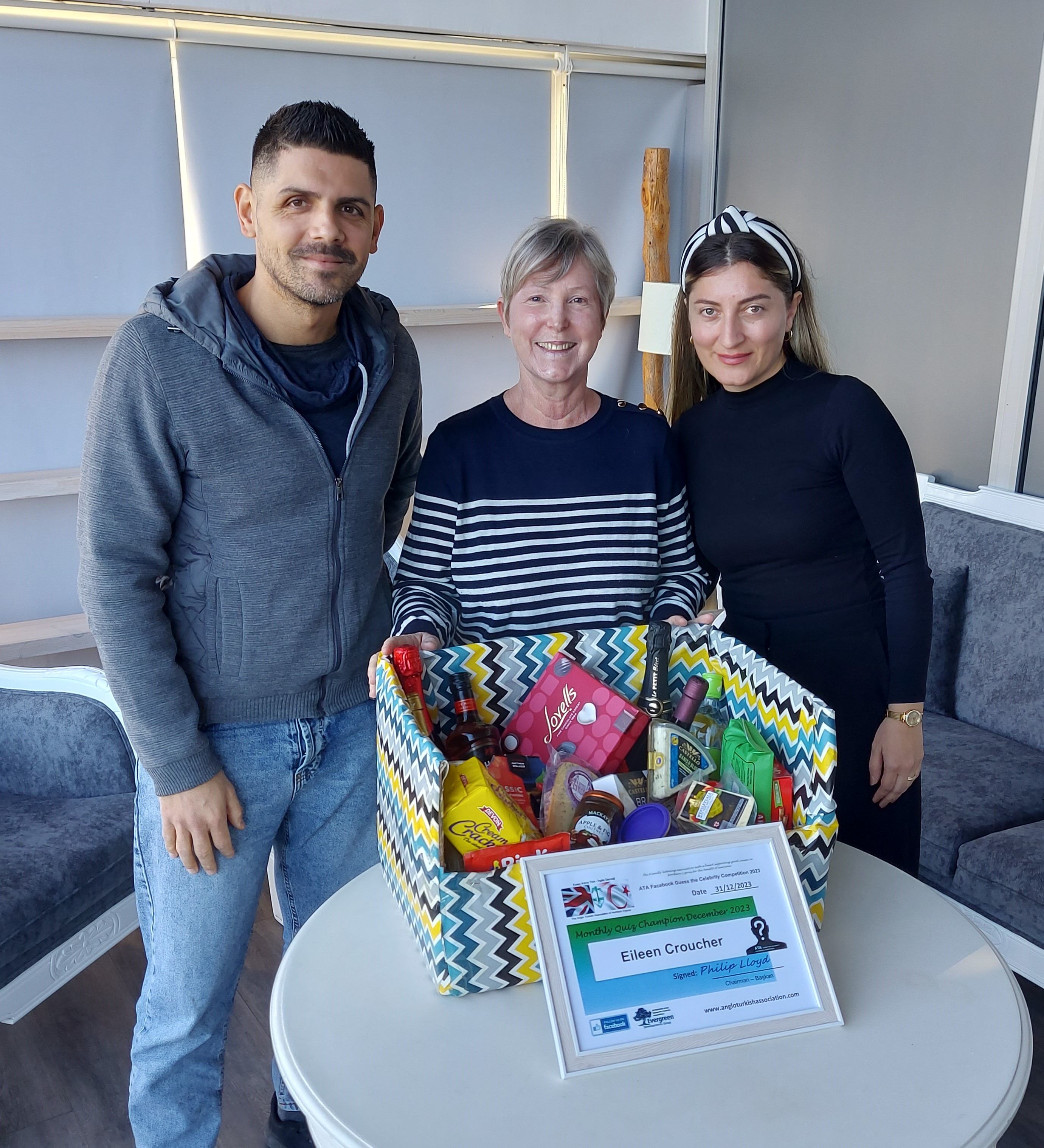 DECEMBER 2023 Overall Year End prize winner Eileen Croucher (person with the most correct guesses during the year) seen here receiving her winners prize and certificate from Huseyin Kayimoglu and Muge Karatas of competition sponsors Evergreen Developments Group
