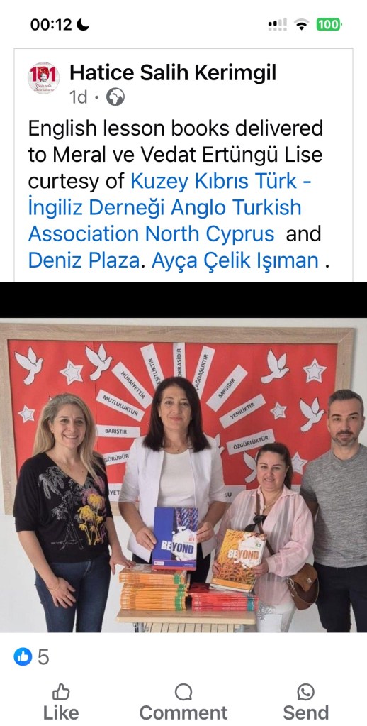 ATA’s latest ‘good cause’. English lesson books delivered to Meral ve Vedat Ertüngü Lise curtesy of Kuzey Kıbrıs Türk – İngiliz Derneği Anglo Turkish Association North Cyprus and Deniz Plaza. Ayça Çelik Işıman
